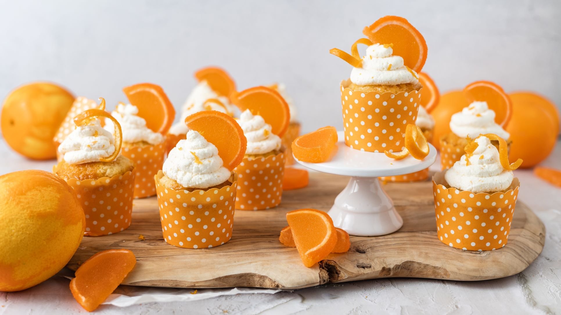 Answer: There are a couple of different techniques you can use to create an orange peel curl. If you have a citrus strip zester, you can take this tool, place the large hole at the top of the orange and press in while rotating the orange in a circle to create one long strand that can be cut into several strips. If you don't have a zester you can use a vegetable peeler. Start at the top of the orange, press down lightly with the peeler and rotate the orange as if you were peeling an apple, to create one long strip of peel. When using a vegetable peeler take care not to go too deep and cut off the pith (the white part of the orange). It has a bitter taste. Take the peel and cut it with a small knife into the desired length. If the peel is too wide you can cut it into thinner strips. Take a toothpick and gently twist your peel around the toothpick to create a decorative curl. Place on the top of the cupcake to the side of the orange candy slice.