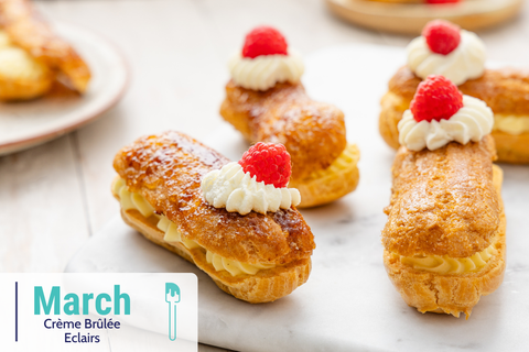 Classic French éclairs filled with vanilla bean custard and topped with a crisp, caramelized brûlée finish.
