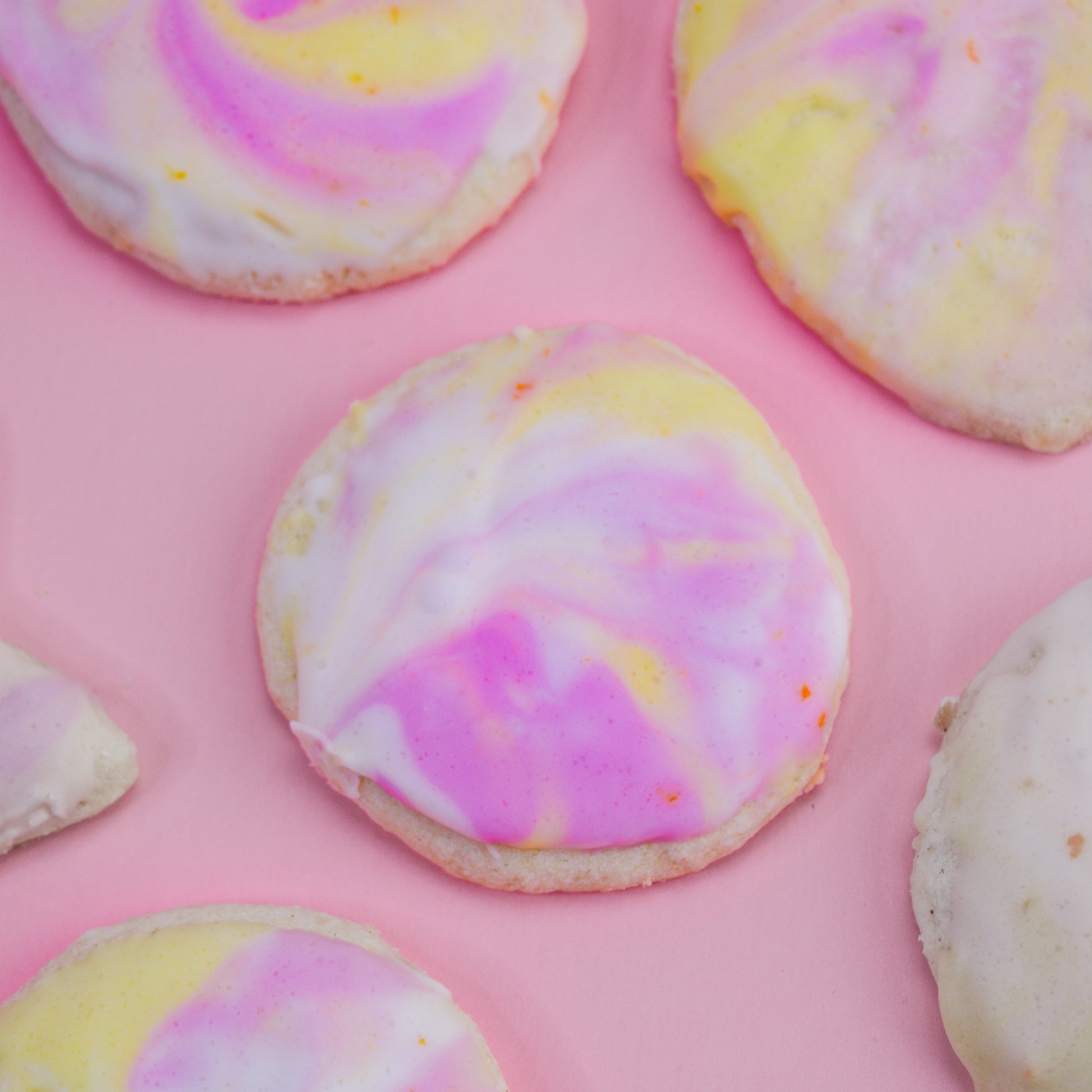 Get ready to learn a fun and enchanting color swirl technique for a dazzling tie-dye effect! Let your creativity run wild as you make this beautiful and delicious treat! Makes 18 cookies.