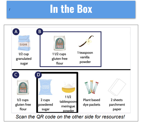 - A kitchen tool to enhance your baking experience (ex: decorating tools, zester, sifter). Note: Kids kits do not include a tool.